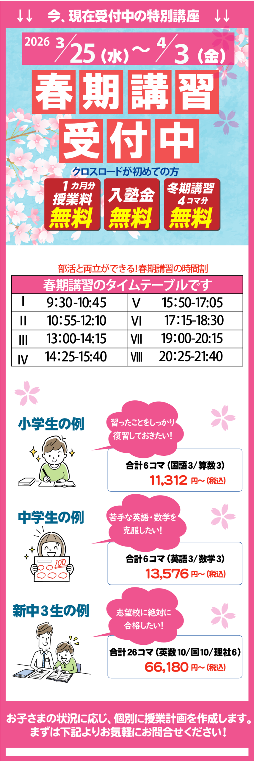 多くの子どもたちにとって、人生で最初の試練となる高校入試。クロスロードの中学生コースでも、第一志望校に合格するための学力を身に付けることが最大の目標です。ただ、中学校の3年間は、子どもたちが大人への階段を上る大切な時期。