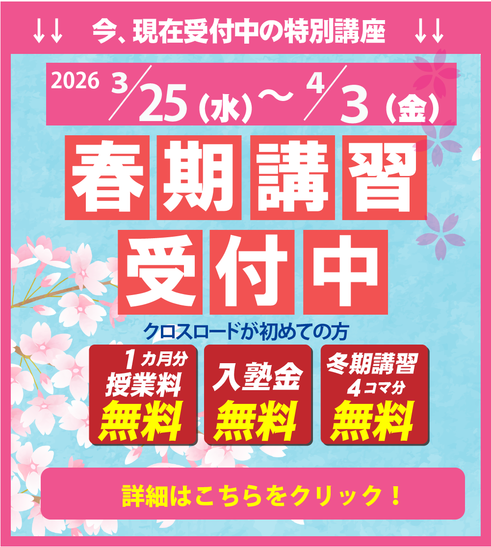 これらは、「能力」ではなく「スキル」です。なので、ちゃんとそのスキルを持っている人に教われば、必ず身に付きます。学習スキルを獲得させることで自発的な学習活動を促し、成果(=学力向上)と自信(=成功体験)を手にする。それを、クロスロード自慢の自分探究ゼミ(全学年対象の無料講座)で、自己の特性と行動を見つめる時間を確保することにより、しっかりと下支えする。これがクロスロードの中学生指導の中心です。第一志望校合格を確実にサポート!